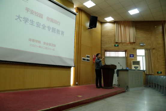 安全保卫部副部长彭冠军做“平安校园 你我同行——老员工安全专题教育”讲座。彭部长重点讲解了防火、防盗、防范电信网络诈骗、校园贷、交通安全等内容,指出同学们要对不明客服、二维码和链接等提高警惕,时刻注意安全和健康,及时下载全民反诈app。
